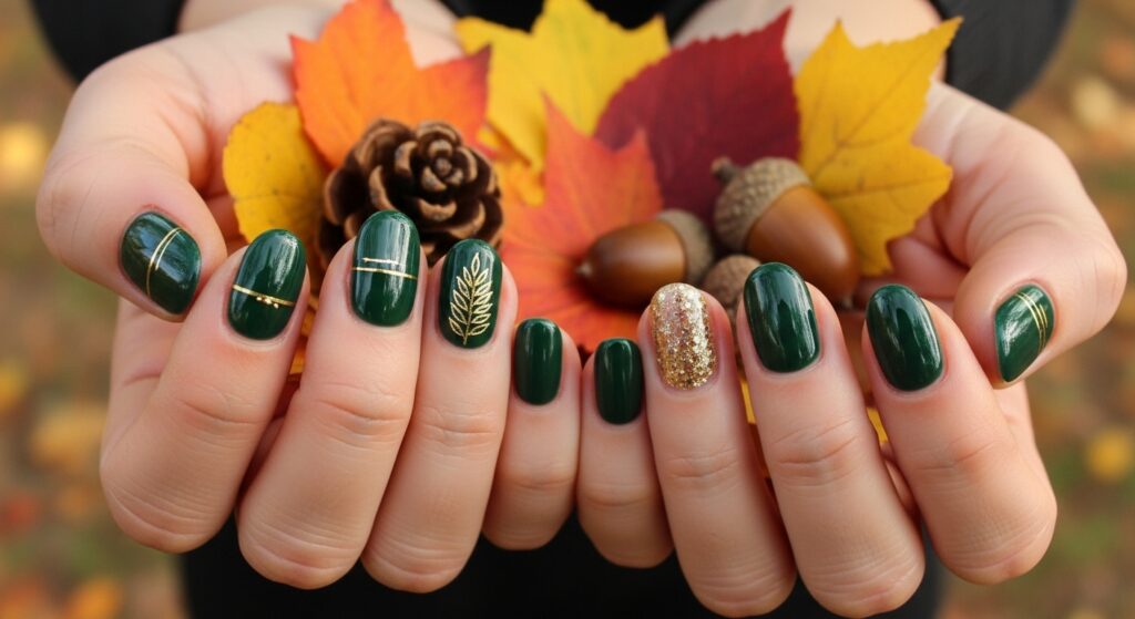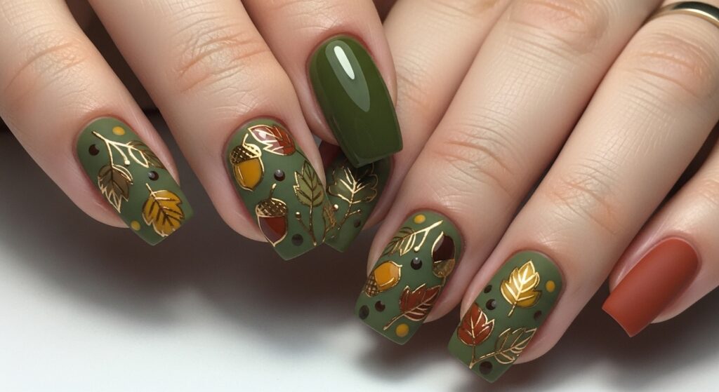 Olive green nails offer earthy elegance perfect for the season. Minimalist gold lines or matte finishes elevate the look even further, making it a trending fall favorite.