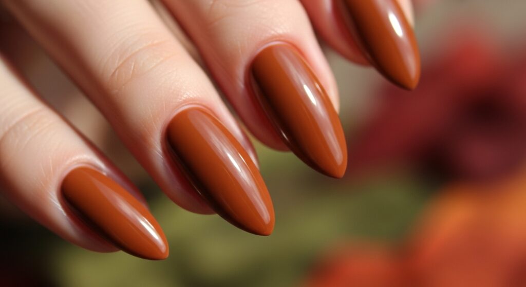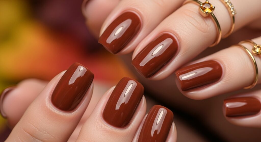 Chocolate brown nails are rich, glossy, and perfect for autumn. This smooth shade provides instant warmth and pairs beautifully with gold jewelry and neutral outfits.