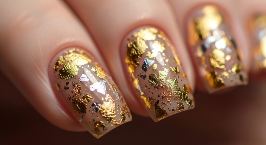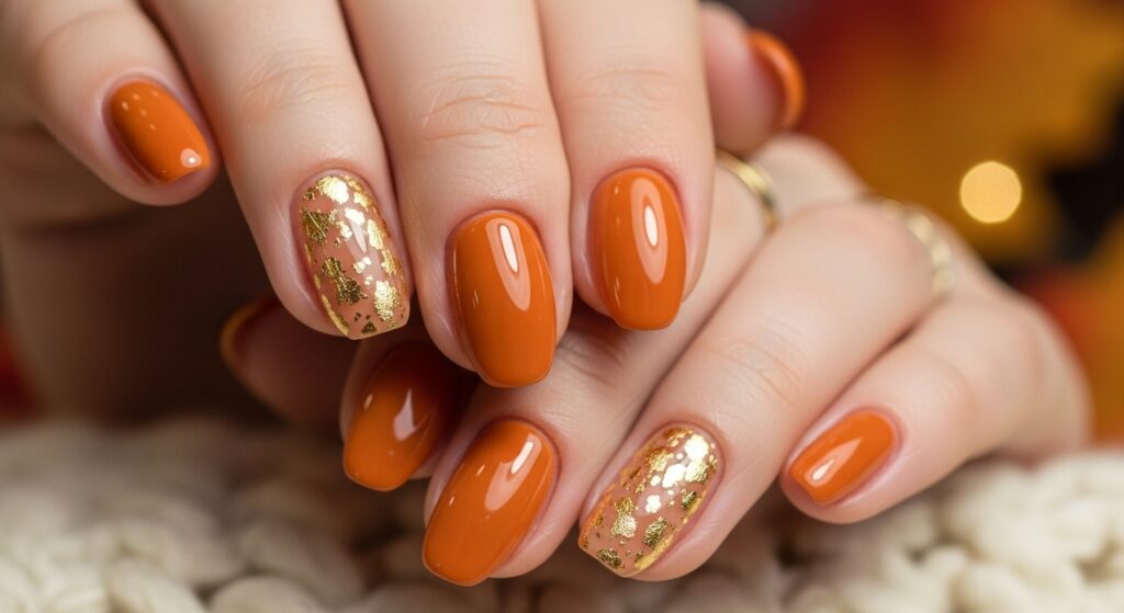 Gold leaf accents add a sparkling touch to fall nails. Whether placed over burgundy, brown, or nude bases, they elevate your manicure instantly. Ideal for parties, nights out, and festive fall gatherings.