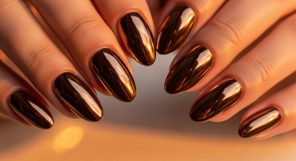Brown chrome nails deliver a reflective metallic finish that’s ultra-trendy this year. The molten-glow shine creates a luxurious autumn vibe, ideal for fashion-forward personalities.