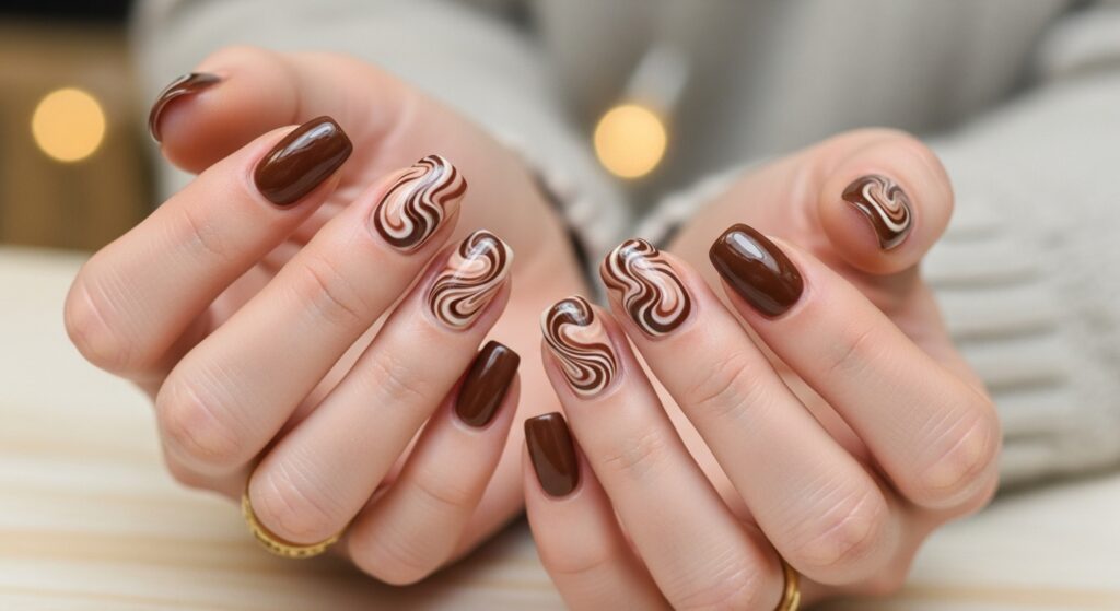Mocha swirl nails blend soft latte and chocolate tones for a cozy fall vibe. The subtle marble effect adds dimension without overpowering the look. Great for coffee lovers and anyone who prefers warm neutrals.