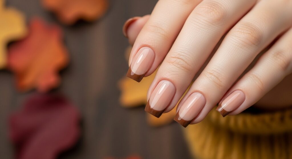A fall twist on French nails, coffee-brown tips over a nude base add warmth and elegance. Great for both casual and office wear.