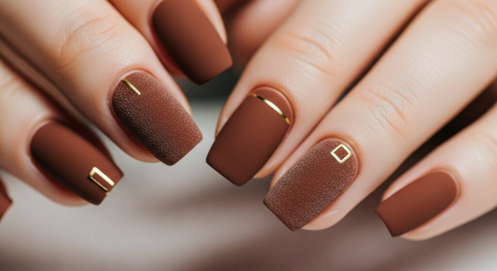 Mocha matte nails deliver soft, velvety brown tones perfect for cozy fall fashion. Simple gold studs or leaf motifs make them even more seasonal.