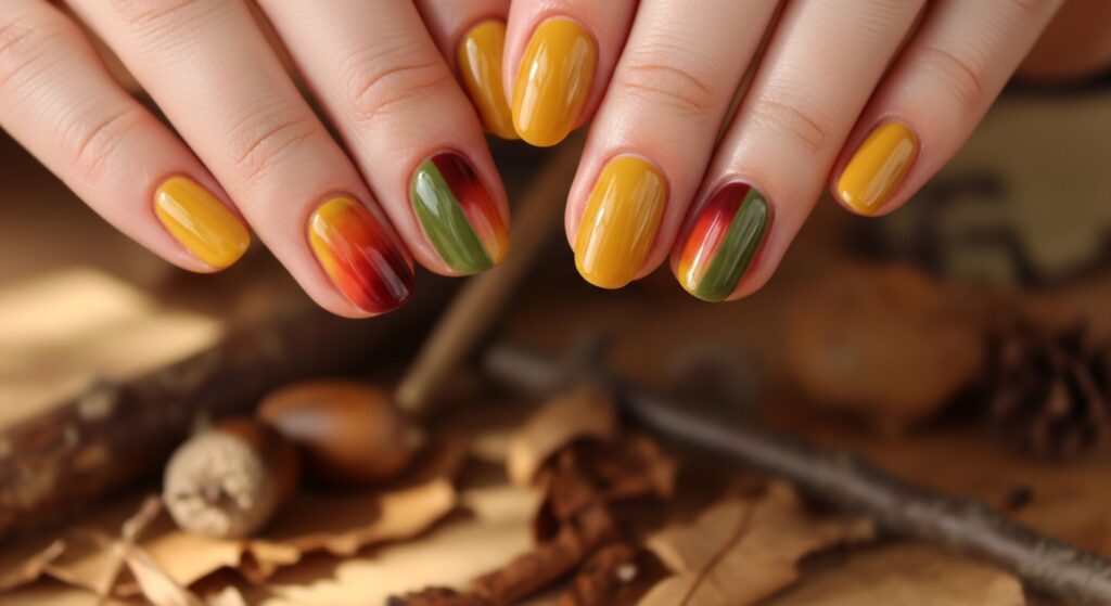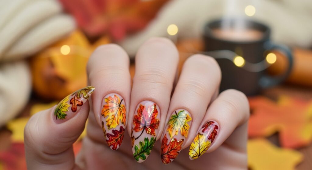 Fall leaf nails celebrate the season with painted or stamped leaves in tones like mustard, burgundy, olive, and burnt orange. Fun, festive, and perfect for creators.