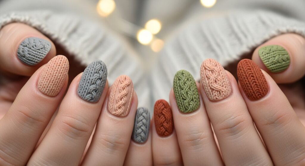 Sweater texture nails replicate cozy knit patterns, making them a must-try for fall 2025. These 3D designs look especially cute in beige, gray, and soft brown shades.