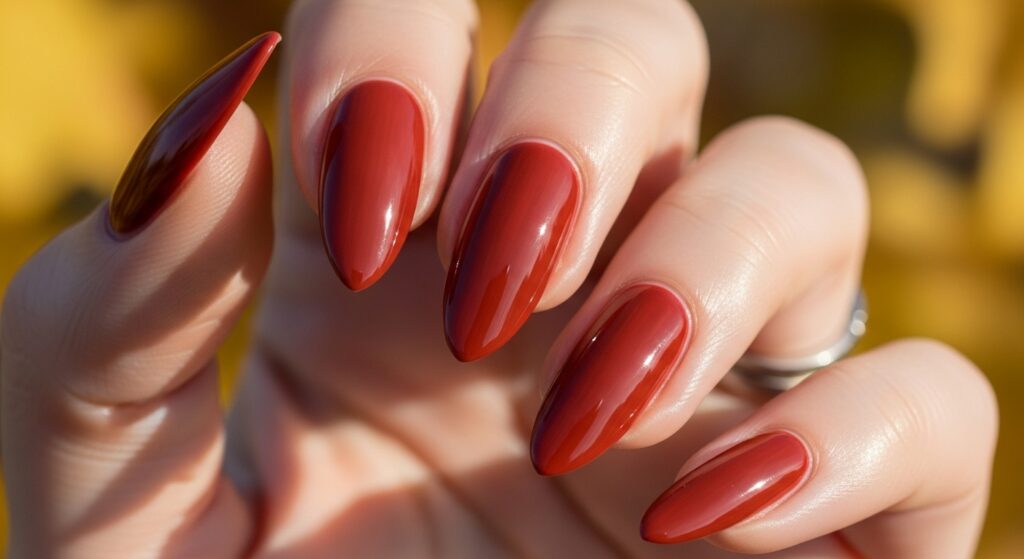 Rusty red nails offer a warm, earthy twist on traditional reds. This shade resembles falling leaves and autumn sunsets, making it perfect for seasonal nail styling. Works beautifully in glossy or matte.