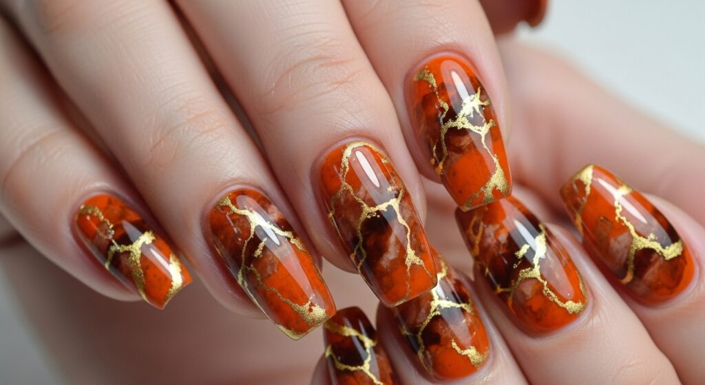 Burnt orange marble nails give your fall look an artistic twist. The swirling tones of orange, caramel, and gold create a trendy, luxurious finish. This design works on all lengths and is perfect for fall photoshoots, events, or everyday glam.