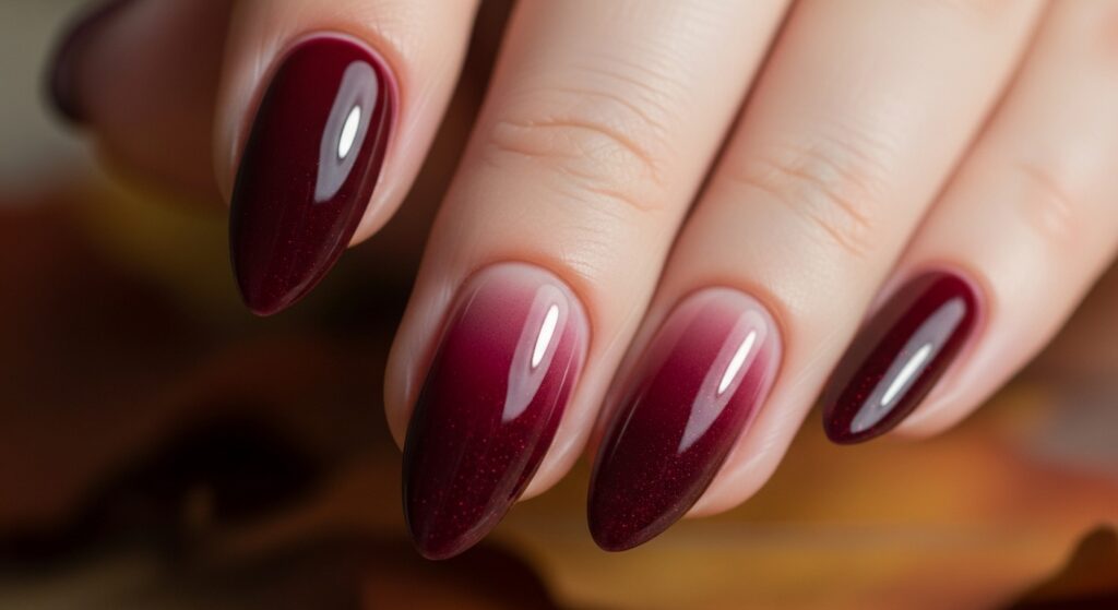 Burgundy ombré nails fade beautifully from dark wine to soft reds or nudes. This gradient look is elegant, dramatic, and perfect for fall events or nighttime outfits.