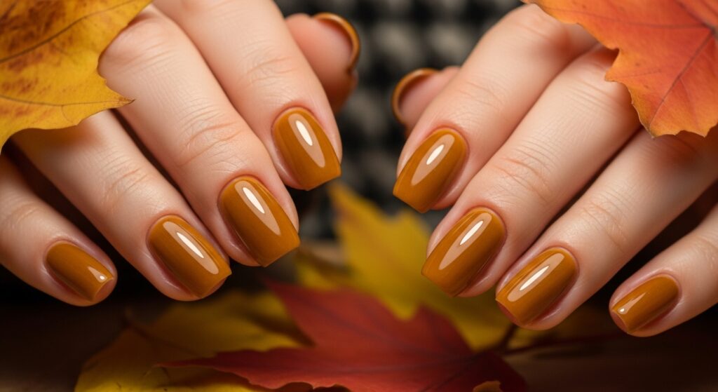 Mustard yellow nails bring a warm retro tone to fall 2025. This bold color resembles autumn leaves and pairs well with earthy outfits.