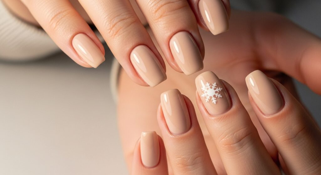 Nude beige nails offer a warm, simple, and elegant winter look. The neutral hue pairs perfectly with winter coats, knits, and scarves. It’s the ideal choice for those who prefer understated manicures but still want a polished appearance. A short or medium shape works beautifully for this clean, minimal winter style.