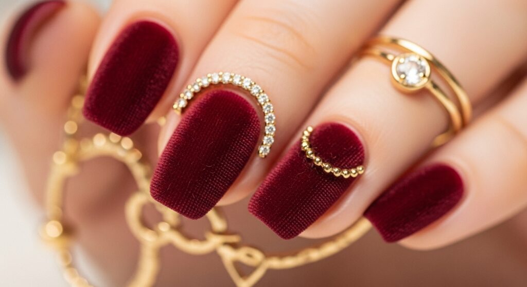 Burgundy velvet nails are a top choice for fall and winter, giving a rich, cozy, and luxurious look. The soft, velvety finish adds depth while keeping the manicure elegant and bold. This style works beautifully for holiday dinners, November gatherings, or classic winter outfits. Pair it with gold rings for an elevated seasonal touch
