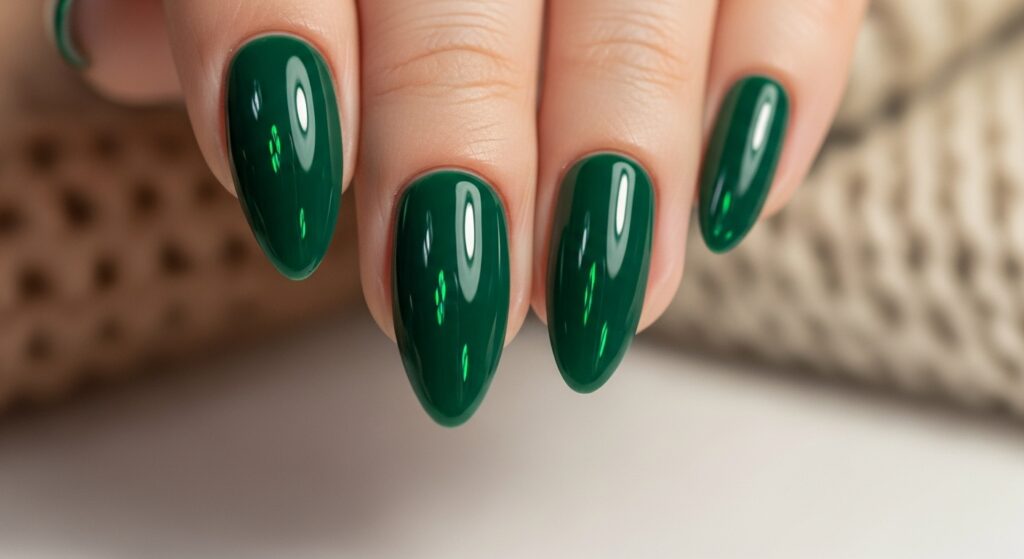 Forest green nails remain one of the most popular shades for late fall and early winter. The rich, deep tone complements classic coats, knits, and holiday outfits. It works well on both short and long nails, adding a stylish seasonal touch without being too bold. The glossy finish enhances the polished, elegant feel.