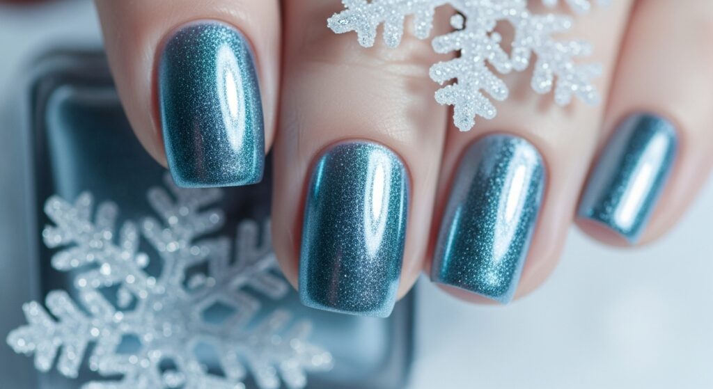 Snowflake accent nails are a winter classic that never loses appeal. Soft blue, icy white, or silver tones make the perfect base for delicate snowflake art. This look is ideal for holiday parties, December gatherings, and winter photoshoots. It delivers a frosty yet elegant seasonal charm.