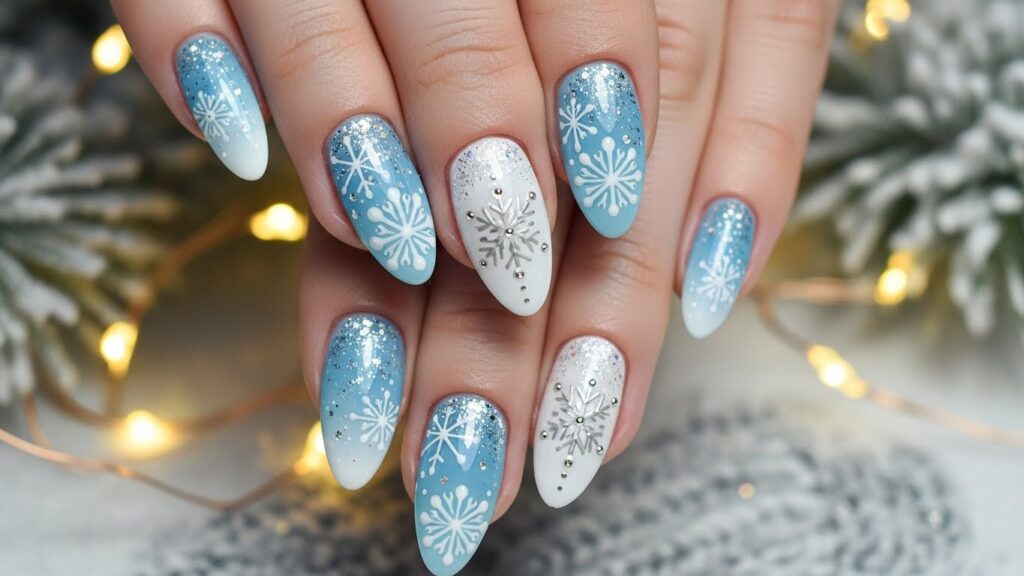 Snowflake winter nails are a must-try trend for 2025–2026, bringing a festive and magical touch to your holiday look. Soft blues, frosty whites, and glittery accents create a dreamy snow-inspired manicure perfect for Christmas and the winter season. Whether you choose delicate hand-painted flakes or subtle stamped designs, these nails capture cozy winter charm in the cutest way.