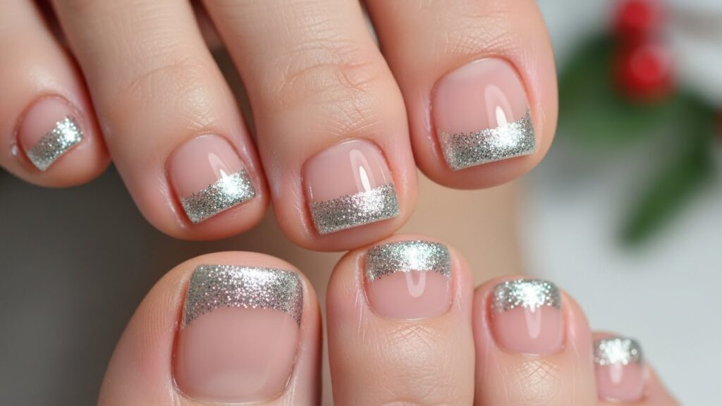 Silver glitter toenails add a festive sparkle to the winter season. A simple nude or white base with a glittery accent toe creates a stylish, eye-catching look without being too bold. It’s perfect for holiday events, winter vacations, or a playful seasonal refresh. This pedicure trend brings just the right amount of shimmer for cold-weather glamour.